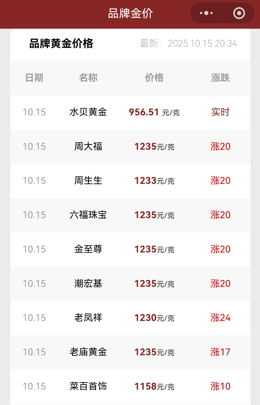 品牌黄金饰品方面,10月15日,周大福、六福珠宝、潮宏基、老庙黄金等多家品牌旗下足金首饰价格飙升至1235元/克,周生生为1233元/克,老凤祥为1230元/克,较前一日均有明显上涨。