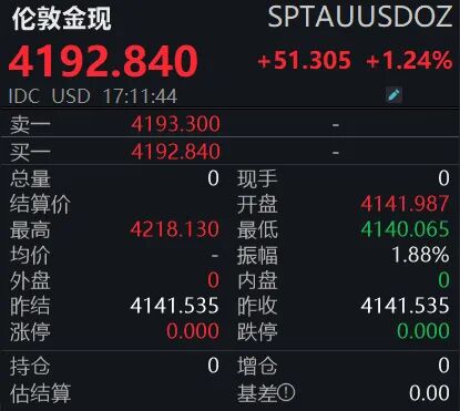 10月15日,国际金价稳步上涨,盘中站上4200美元/盎司大关。截至记者发稿,伦敦金现报4192.84美元/盎司,日内涨1.24%,盘中最高触及4218.13美元/盎司,再创历史新高。