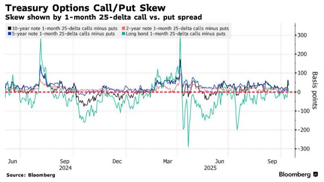 美国国债期权偏斜数据显示,美国10年期国债期货“看涨期权对冲溢价”相对于“看跌期权”近期已升至4月以来的最高水平。这表明,相较于对冲国债抛售风险,交易员更愿意为对冲国债上涨(即收益率下跌)风险支付更高溢价。在长期端(长期国债期权),经过过去几周“偏向看跌期权”的走势后,偏斜指标已回落至接近中性水平。