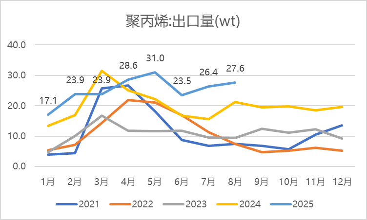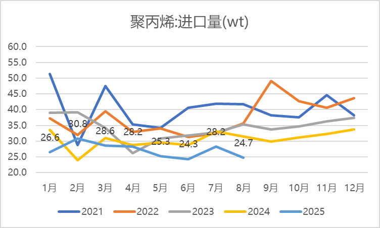 从聚丙烯供需层面来看,就直接相关的进出口来看,目前聚丙烯进口呈现逐年下降的趋势,2025年1-8月累计进口216.8万吨,同比减少10%,月均进口量不足30万吨,且主要进口来源于韩国、新加坡、阿联酋、中国台湾及日本,美国进口占比不足5%且可被替代。出口方面,目前聚丙烯出口呈现逐年上升的趋势,2025年1-8月累计出口202万吨,同比增加24%,月均出口即将接近30万吨,且今年有望看到出口量大于进口量的情形、实现净出口,中国聚丙烯主要出口地区包括越南、印度尼西亚、泰国、孟加拉国、秘鲁、印度等国家,并不出口至欧美地区。因此,美国再提关税对聚丙烯进出口无直接影响。