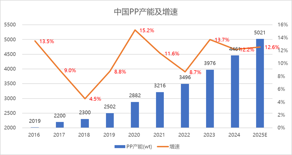 供应方面,中国聚丙烯产能正处于扩产周期,产能、产量同步增长,受需求拖累影响,聚丙烯价格中枢回落、各工艺利润显著走弱,除煤制工艺外,基本全线亏损,聚丙烯产能利用率整体呈现回落趋势。从2025年1-9月数据来看,中国聚丙烯产能新增565.5万吨(含150万吨PP粉料产能),同比增长14.7%;产能累计2979万吨,同比增长16.8%。从目前投产计划来看,受美国再提关税影响相对有限。