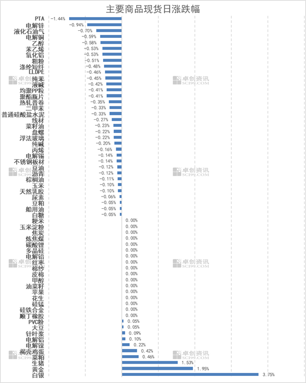 10月15日,卓创资讯监测商品现货市场10种上涨、34种下跌,17种企稳。随着美联储持续释放偏鸽信号,以及中美贸易紧张的推动,贵金属继续拉升。二次育肥入市推涨生猪价格上行。下游产销情况不佳,PTA价格下跌。(价格涨跌幅均以卓创资讯监测现货商品均价或主流市场价格计算)