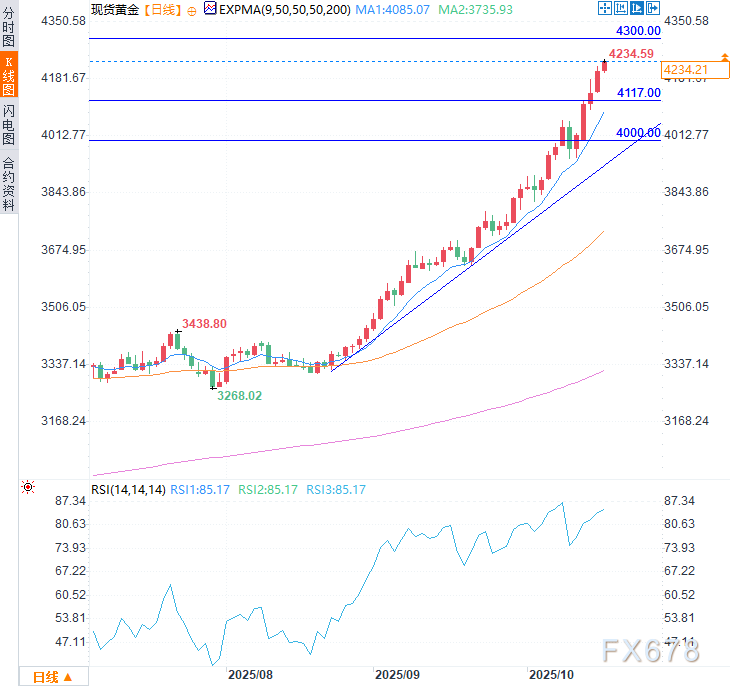 上行目标则指向4300美元、4400美元等整数价位。