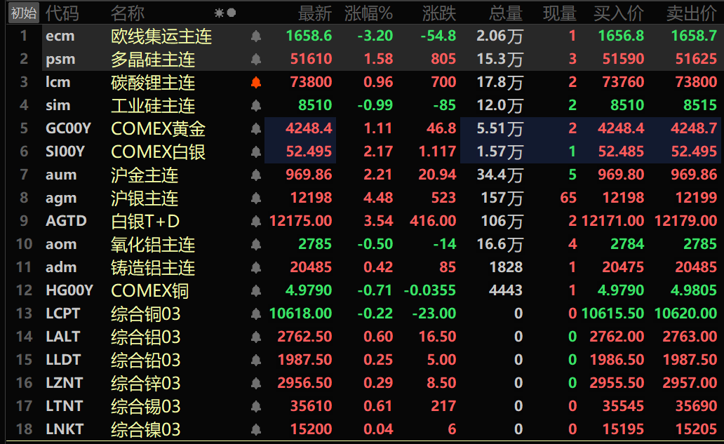 此外,铸造铝主连期货涨0.42%,氧化铝主连跌0.5%。碳酸锂主连涨0.96%,工业硅主连跌0.99%。多晶硅主连涨1.58%。
