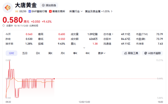 黄金及贵金属板块延续涨势大唐黄金涨超9%