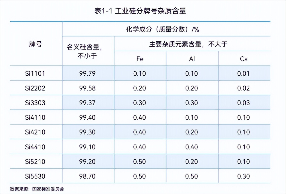 根据工业硅国家标准(GBT 2881- -2014),工业硅按3种主要杂质(铁、铝、钙)含量的差异,分为Si5530、Si4410、 Si4210、 Si3303、Si2202等 规格。工业硅的名义硅含量为100.0%减去杂质总和的余量,其余表中未列的微量元素含量不影响牌号的划分。