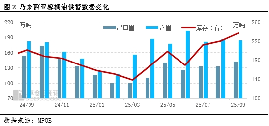 10月10日马来西亚棕榈油总署MPOB公布9月供需报告,9月底产量为184.12万吨,环比降低0.73%;出口量为142.76万吨,环比增加7.69%;国内消费为33.35万吨,环比降低33.21%;月末库存增至236.10万吨,环比增加7.20%。报告发布前,市场预计马来西亚9月底棕榈油库存为215-216万吨,产量178-179万吨,出口143万吨。对比看出,棕榈油库存、产量数据超过市场预期,报告偏空。另外马来西亚棕榈油库存连续第七个月增长,且创2024年12月以来新高,标志着马来西亚棕榈油市场从供需紧平衡转向宽松。受此影响,10日棕榈油现货明显下滑,国内棕榈油现货港口24度均价为9476元/吨,较前一个工作日跌130元/吨,跌幅1.35%。