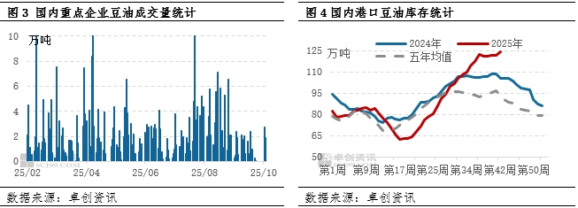 三季度国内豆油厂整体维持高开工负荷率,豆油产出量大,因中美贸易情况不明朗,下游观望为主,需求不及市场预期,造成豆油库存不断增加。国庆长假后,油厂开工陆续恢复正常,而市场提货热情不高,豆油库存继续增加,截至10月10日,港口重点地区豆油库存123.93万吨,较9月26日增加1.96%,达到近五年最高水平,其中五年同期均值为92.70万吨。国内豆油库存偏高,说明豆油供应量庞大,从而给予豆油市场下滑压力,限制涨幅。