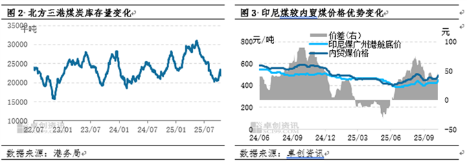 北方港口库存来看,10月份港口煤炭库存量先增后有所减少,但整体维持在今年以来低位水平附近窄幅波动,据港务局数据显示,截至10月15日,北方三港(秦皇岛、曹妃甸、京唐港)煤炭库存总量为2196万吨,较历史高点(5月12日)3109万吨,减少913万吨,降幅29.37%,较年内库存低点(9月3日)2035万吨增加161万吨,增幅7.91%。10月份正处于大秦线检修期,检修时间为10月7日至10月26日,共计20天,大秦线检修将导致煤炭资源集港量减少,同时主产区煤矿产量收紧、叠加发运倒挂情况影响,北方港口煤炭资源调入量整体比较受限。