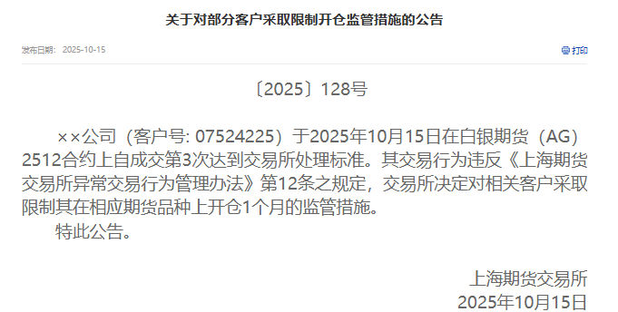 10月15日,上海期货交易所发布关于对部分客户采取限制开仓监管措施的公告,××公司(客户号:07524225)于2025年10月15日在白银期货(AG)2512合约上自成交第3次达到交易所处理标准。其交易行为违反《上海期货交易所异常交易行为管理办法》第12条之规定,交易所决定对相关客户采取限制其在相应期货品种上开仓1个月的监管措施。