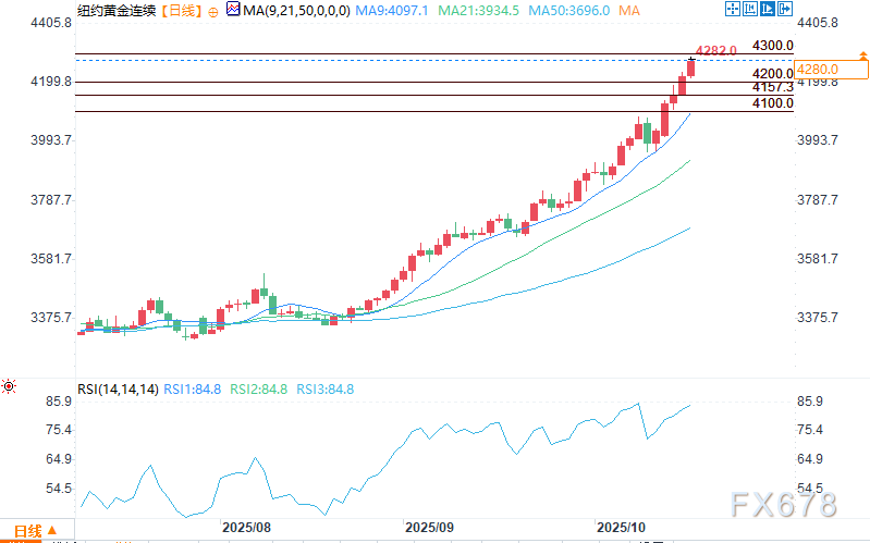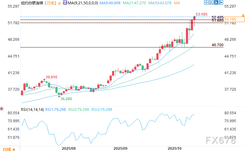 汇通财经APP讯——周四(10月16日)美盘时段,黄金和白银价格在隔夜大幅上涨,并创下历史峰值。12月交割的黄金期货(目前价格高于现货金十几美元)盘中价格创下每盎司4263.40美元的历史新高,12月交割的白银期货盘中价格则达到每盎司52.89美元的历史高点。持续的避险需求与技术性买盘推动价格不断攀升,黄金和白银市场的空头投资者则选择观望,不愿螳臂当车。
