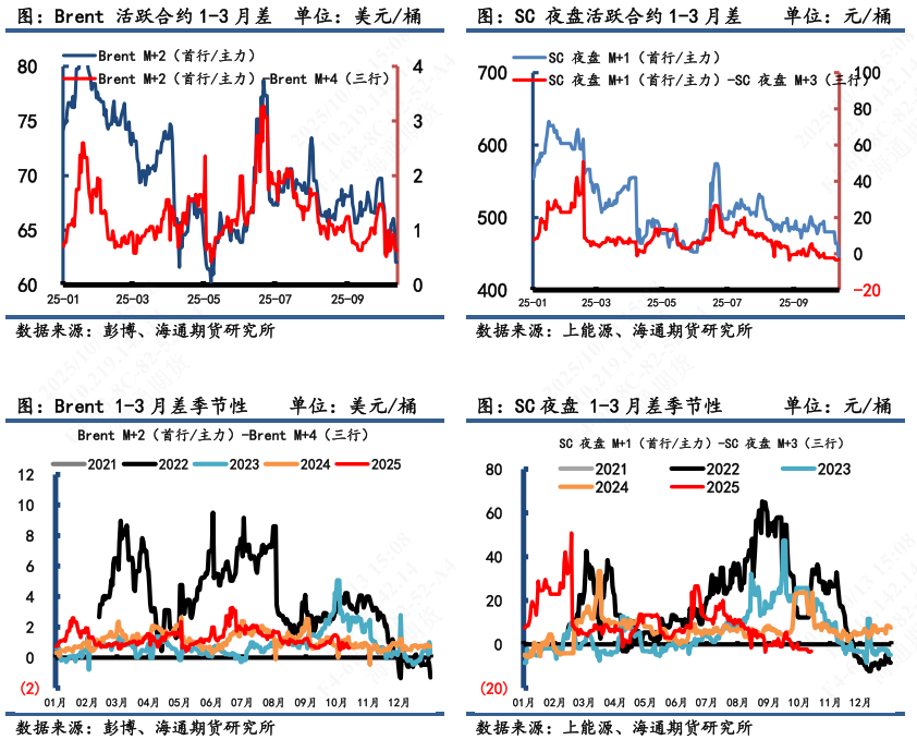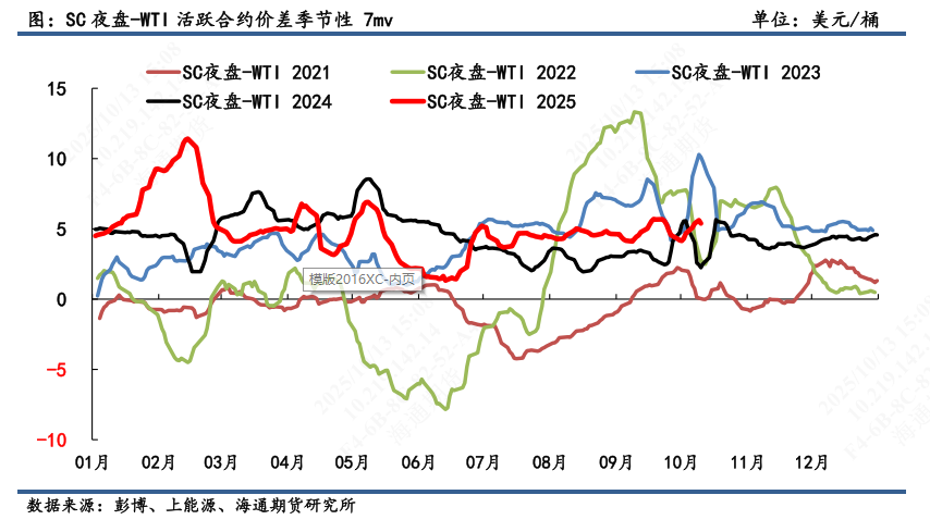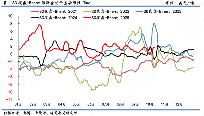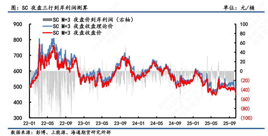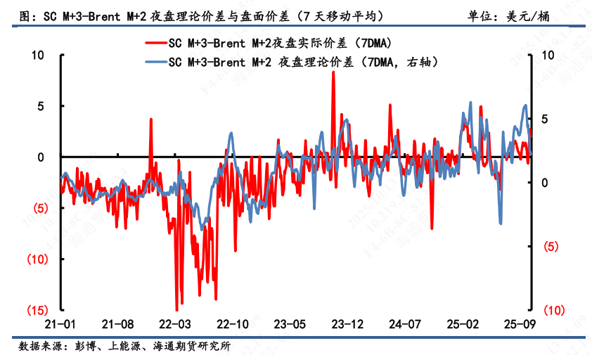 2)套利:①估值:10月10日凌晨2:30,Brent 2512盘面价为65.13美元/桶,SC 2601盘面价为448.1元/桶,测算SC 2601盘面理论价为464.1元/桶,当天盘面估值偏离程度-3.44%。从7天移动平均估值值中,以【-5%,0】为正常区间来看,处于估值常态。②利润:测算SC2601盘面到岸利润-13.27元/桶,折合-1.86美元/桶。③价差:SC2601-Brent2512盘面差为+0.31美元/桶,理论差2.17美元/桶,盘面价差低于理论价差。(注:上周Brent首行为2512;SC首行为2601;其中M代表时下10月)