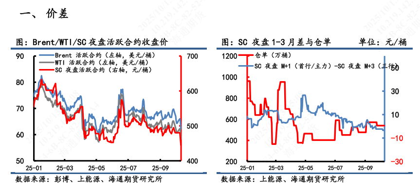 1) 价差:10月10日,SC 夜盘1-3月差-3.10元/桶,换算成-0.43美元/桶;Brent 1-3月差为0.63美元/桶;WTI 1-3月差为0.58美元/桶。SC夜盘-Brent主力合约为-0.26美元/桶;SC夜盘-WTI主力合约为3.45美元/桶。