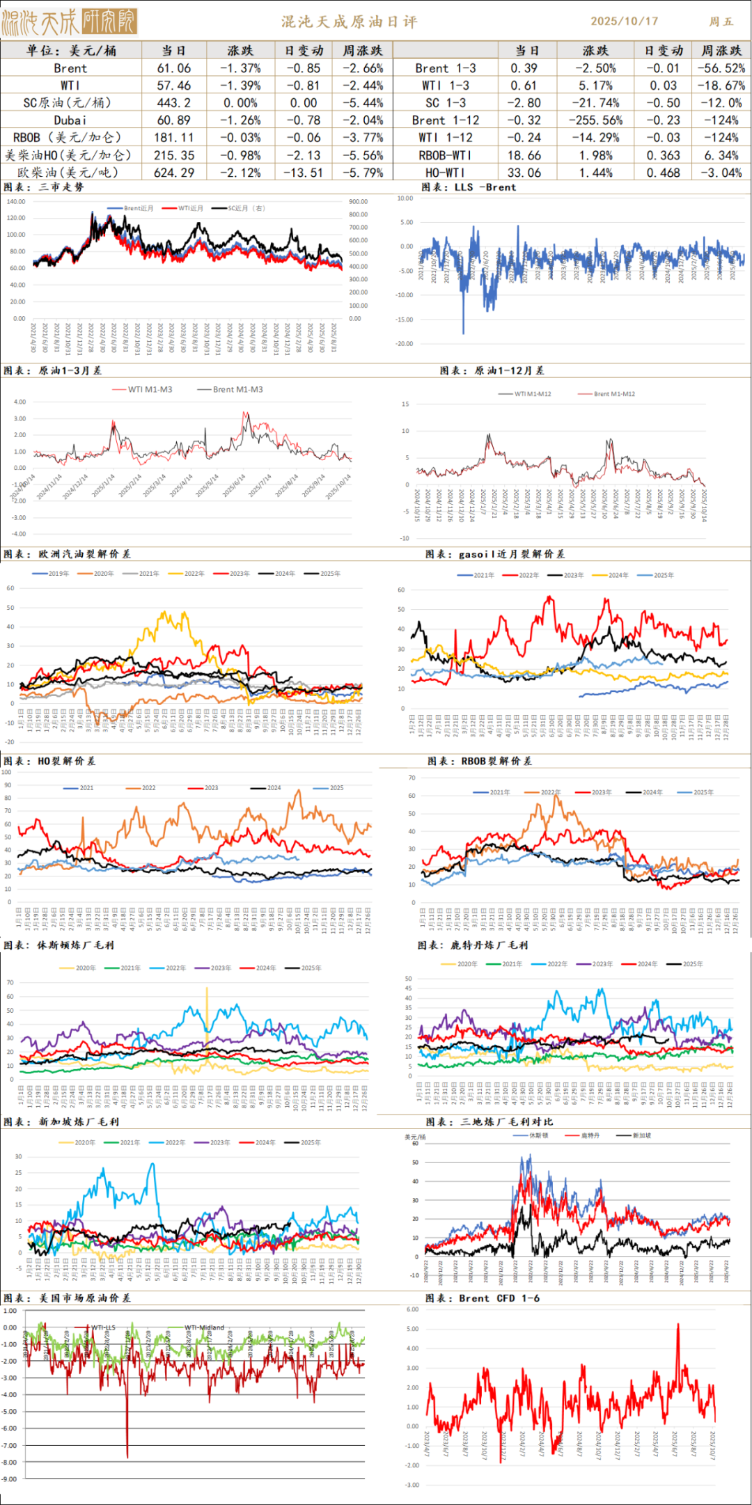 供应端:OPEC+新一轮会议宣布将在11月继续增产13.7万桶/日,争夺份额意图明显。加沙停火协议达成,中东地缘冲突有望平息。乌克兰继续袭击俄罗斯炼油厂,管道和天然气站等能源设施,美俄领导人通话,表示将继续努力结束战争。