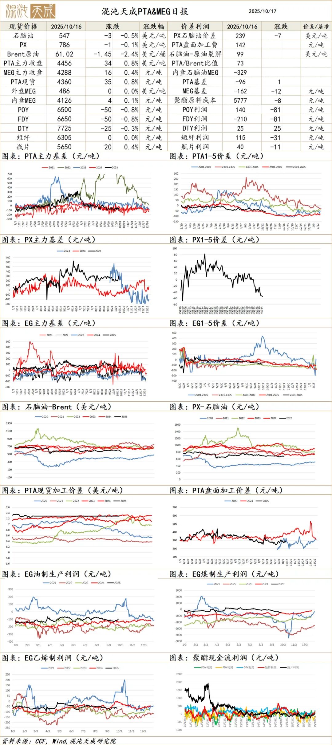 观点:PX开工偏高,PTA兑现计划检修,聚酯假期开工持稳,整体由紧转平衡,但基本面驱动仍在其次,主要驱动还在原油。目前基本面、反内卷政策、原油仍未形成共振,只是估值偏低。