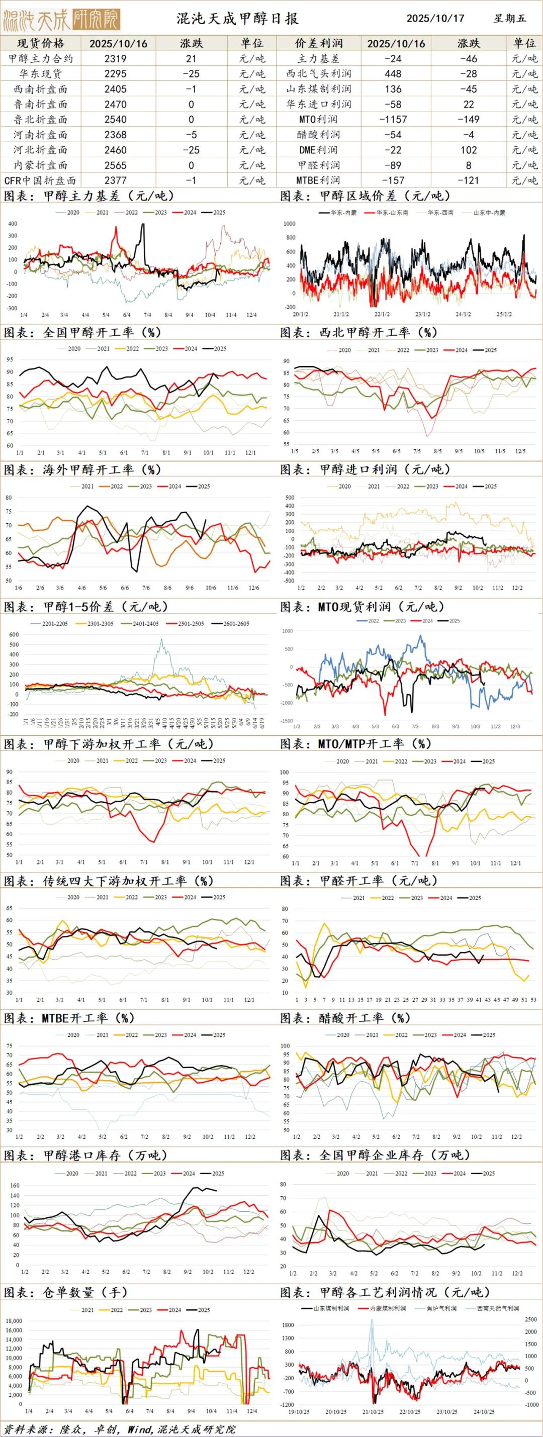 供给:国内开工小降,高位水平。海外短停结束开工回升,目前预计10月130+,但因9月有延期存集中到港;冬季潜在利多是伊朗提前限气影响进口。反内卷影响暂不大,主要受煤支撑。上周五晚传伊朗被制裁(暂未证实),静态评估暂实际影响不大,如果制裁进一步上升,等效于伊朗提前限气提前发酵。