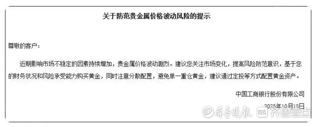 此外,工商银行、建设银行、光大银行等多家银行相继发布价格波动风险提示,提醒投资者基于自身的财务状况和风险承受能力购买黄金。以光大银行为例,其发布的提示显示:近期国内外贵金属价格波动加剧,市场风险提升。请关注市场变化,提高贵金属业务的风险防范意识,合理控制仓位,及时关注持仓情况和保证金余额变化情况,理性投资,守护自身财产安全。建设银行也提醒投资者需提高风险防范意识,合理控制仓位,及时关注持仓与保证金余额变化。