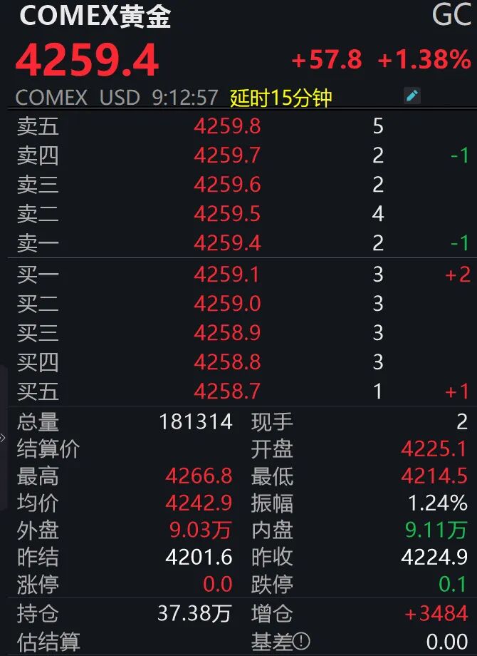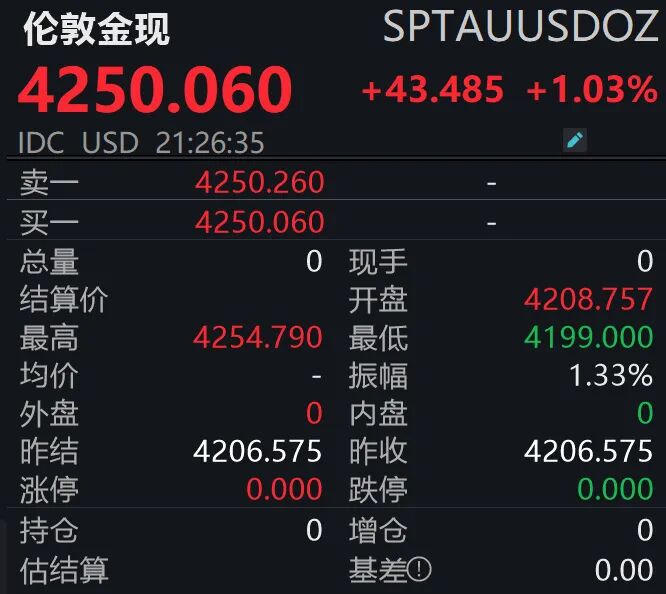 期货方面,COMEX黄金期货亦实现大涨。截至记者发稿,COMEX黄金期货日内涨1.38%,报4259.4美元/盎司,盘中最高触及4266.8美元/盎司,亦创下历史新高。