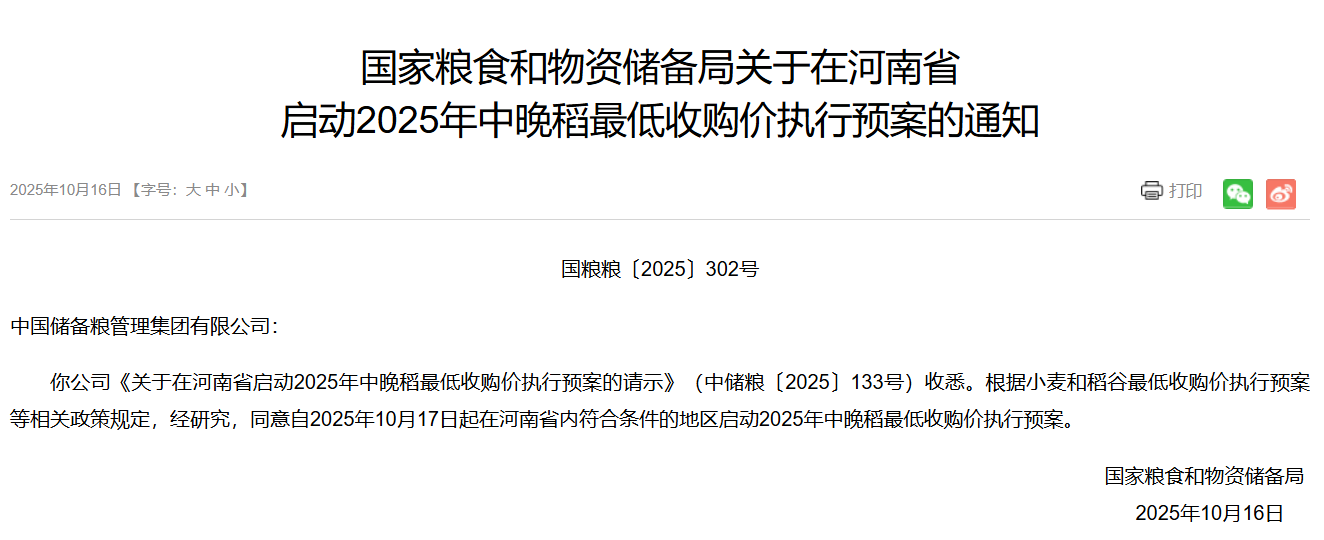 【大河财立方消息】10月16日,国家粮食和物资储备局发布通知,根据小麦和稻谷最低收购价执行预案等相关政策规定,经研究,同意中国储备粮管理集团自2025年10月17日起在河南省内符合条件的地区启动2025年中晚稻最低收购价执行预案。