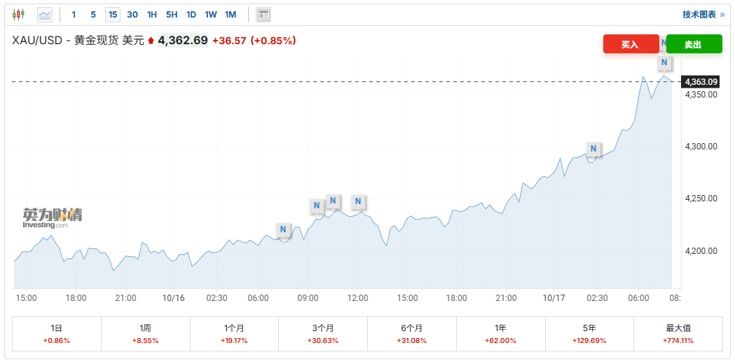 由于对经济中信贷质量的担忧加剧以及地缘政治紧张局势推动了避险需求增加,再加上投资者纷纷押注美联储今年可能实施一次大幅降息,黄金与白银价格均触及历史新高。数据显示,周五亚洲早盘,现货黄金一度上涨1.2%,至每盎司4379.96美元,创下历史新高,并有望创下自2020年以来的最大单周涨幅。现货白银则小幅上涨,触及每盎司54.3775美元的历史高位后回吐了部分涨幅。