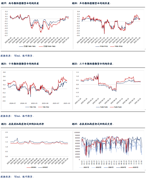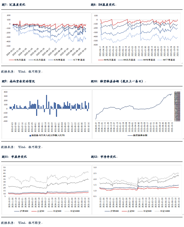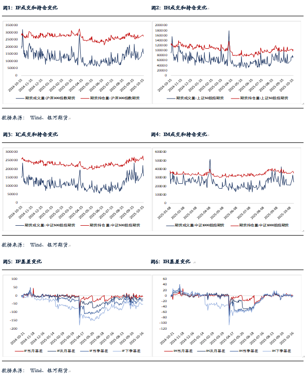股指期货随现货分化,至收盘,主力合约IH2512涨0.8%,IF2512涨0.38%,IC2512跌1.01%,IM2512跌0.95%。基差出现分化,IC远月合约贴水加大,IM和IH基差上行,IF基差保持稳定。IM、IC和IH成交分别下降14.8%、13.2%和1.3%,持仓分别下降4%、3.2%和0.8%;IH成交增加7%,持仓增加5.9%。