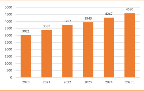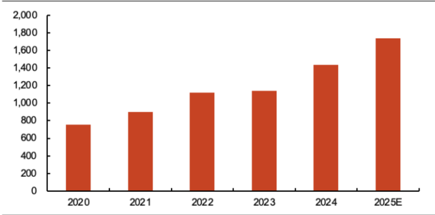 根据中商产业研究院统计及预测,2020年至2024年期间,中国大陆半导体关键材料市场规模由755.8亿元增长至1437.8亿元,对应CAGR约为17.4%。2025年,中国大陆半导体关键材料市场规模将达到1740.8亿元,同比增长21.1%。