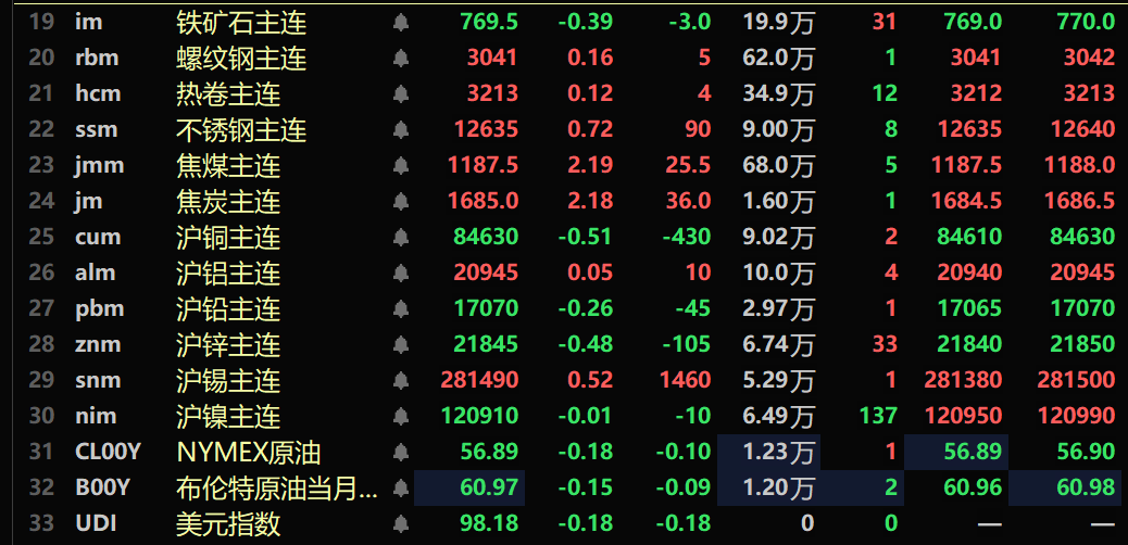 黑色系多飘红,铁矿跌0.39%,螺纹涨0.16%,热卷涨0.12%,不锈钢涨0.72%。双焦方面:焦煤主力合约涨2.19%,焦炭主力合约涨2.18%。