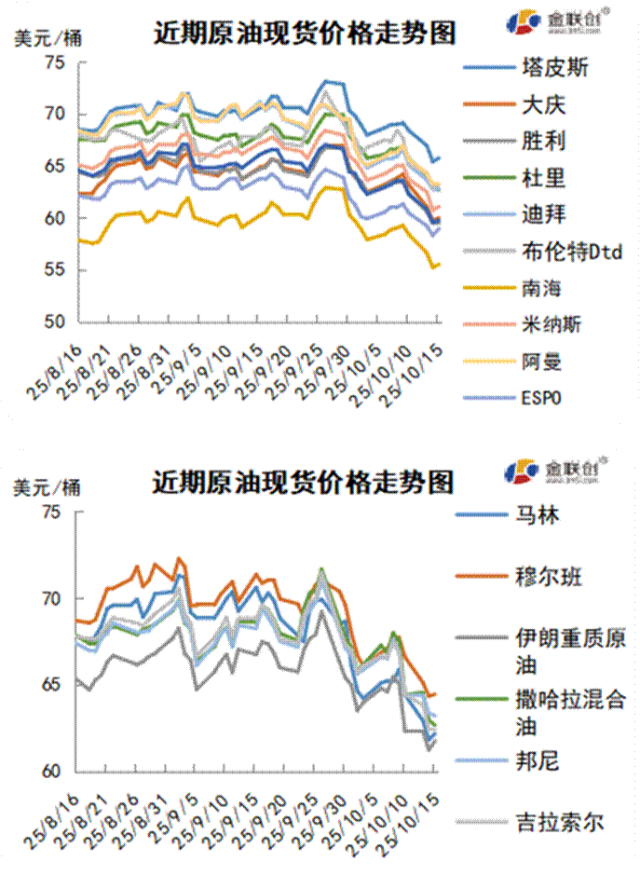 本周(10.9-10.15),原油整体呈现震荡下行的走势,周均价环比下跌。