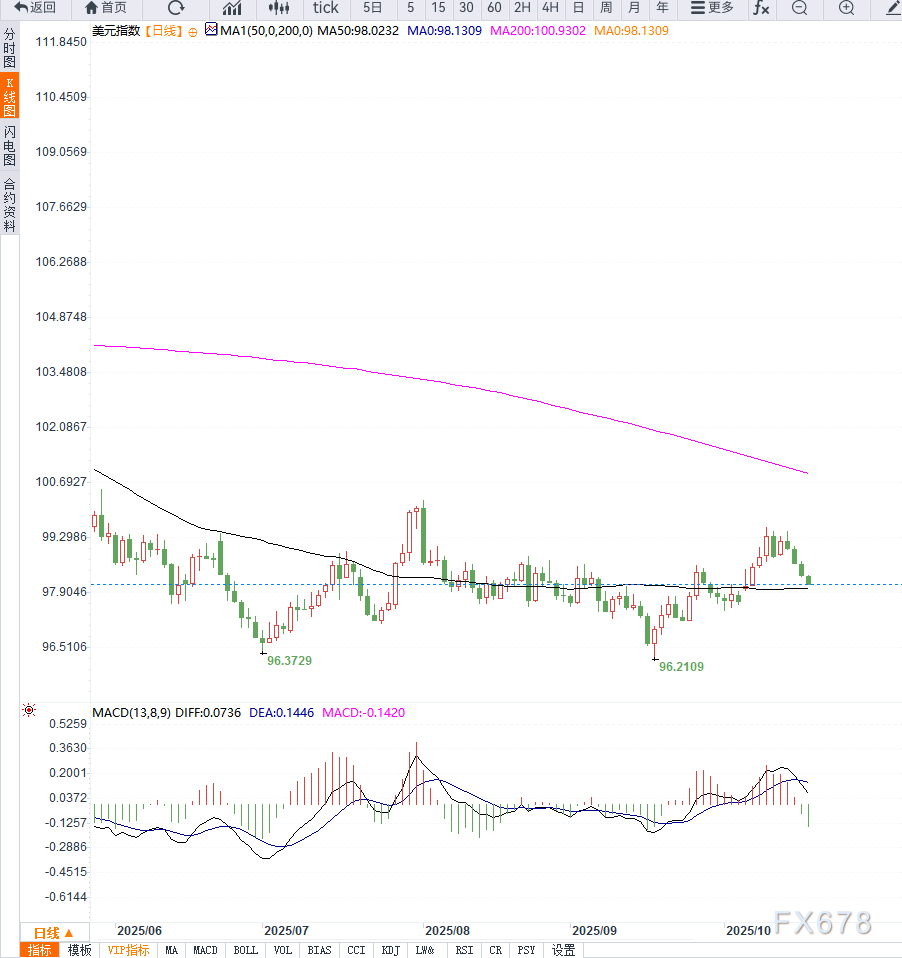 当前美元走势受到多重宏观因素的拖累。在财政僵局与降息预期叠加的环境下,美元短线维持弱势,技术面显示98关口或成为关键支撑。若美联储会议纪要延续鸽派倾向,美元指数或继续下探97.80一线;