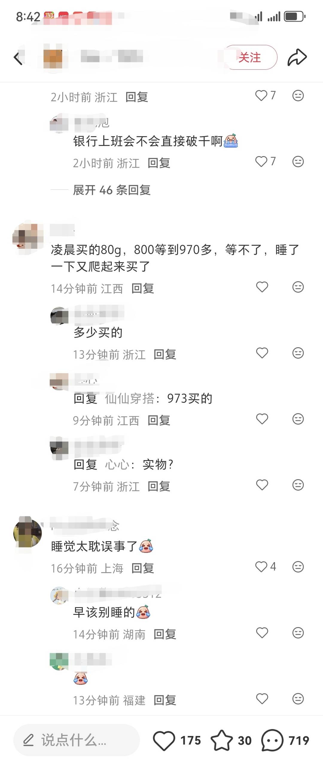 同样彻夜未眠的,还有广西市民孙女士。她凌晨时分果断入手80克,从金价800元/克等到970多元/克时,终究按捺不住出手;可躺下没多久,又担心错过行情,索性爬起来继续加仓。“谁知道一觉醒来会不会直接破千?大脑兴奋得根本静不下来,哪还有心思睡觉。”孙女士的话,正是当下无数黄金投资者的真实写照——在千元大关的关口前,每一分每一秒的波动,都牵动着他们紧绷的神经。