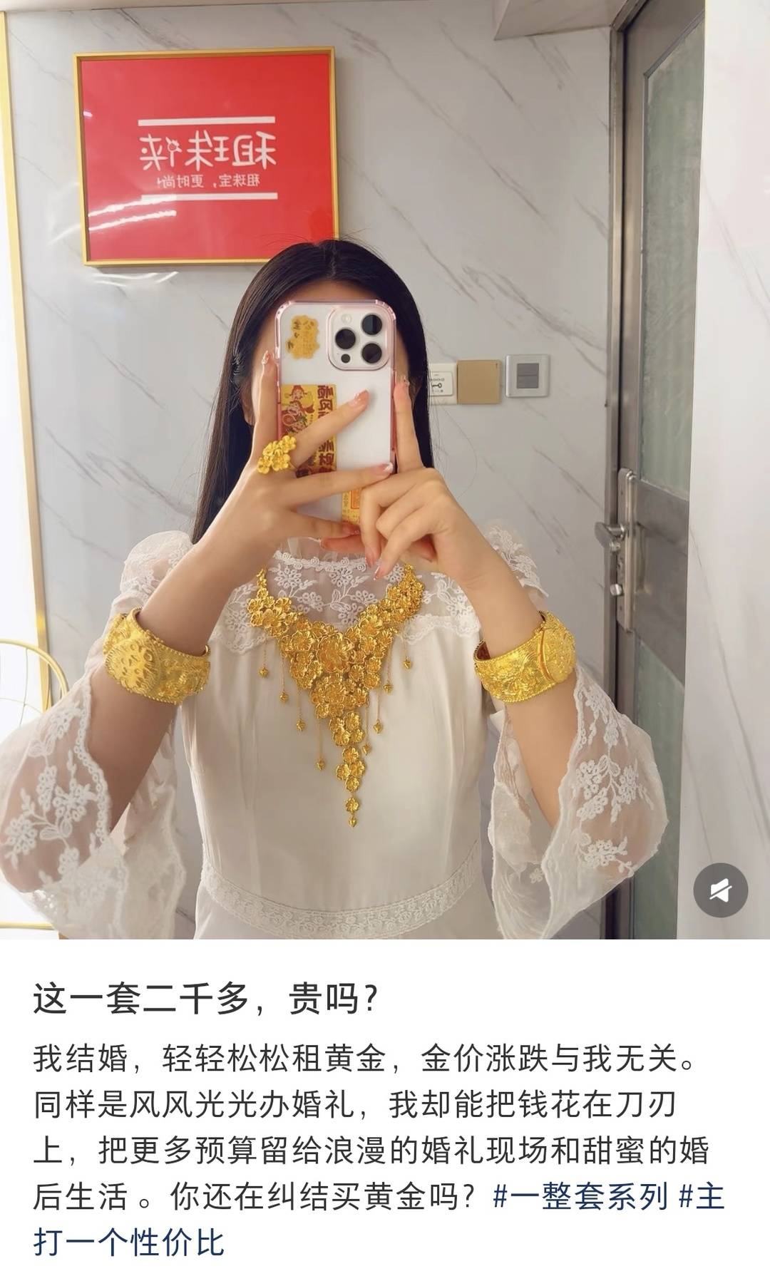 成都新娘陈女士近期刚办完婚礼,她通过本地珠宝租赁平台,租了一套总克重超50克的重工黄金首饰,包括龙凤镯、项链、耳环和戒指,租赁7天花费不到1000元“这套首饰要是买的话,按现在1235元/克的价格,得花6万多,而且婚礼后根本不会戴,压箱底太浪费了。”陈女士算了一笔账,租赁不仅省了近6万元,还省去了后续保养、变现的麻烦,“省下来的钱用来装修新房,比买一堆用不上的首饰划算多了”。