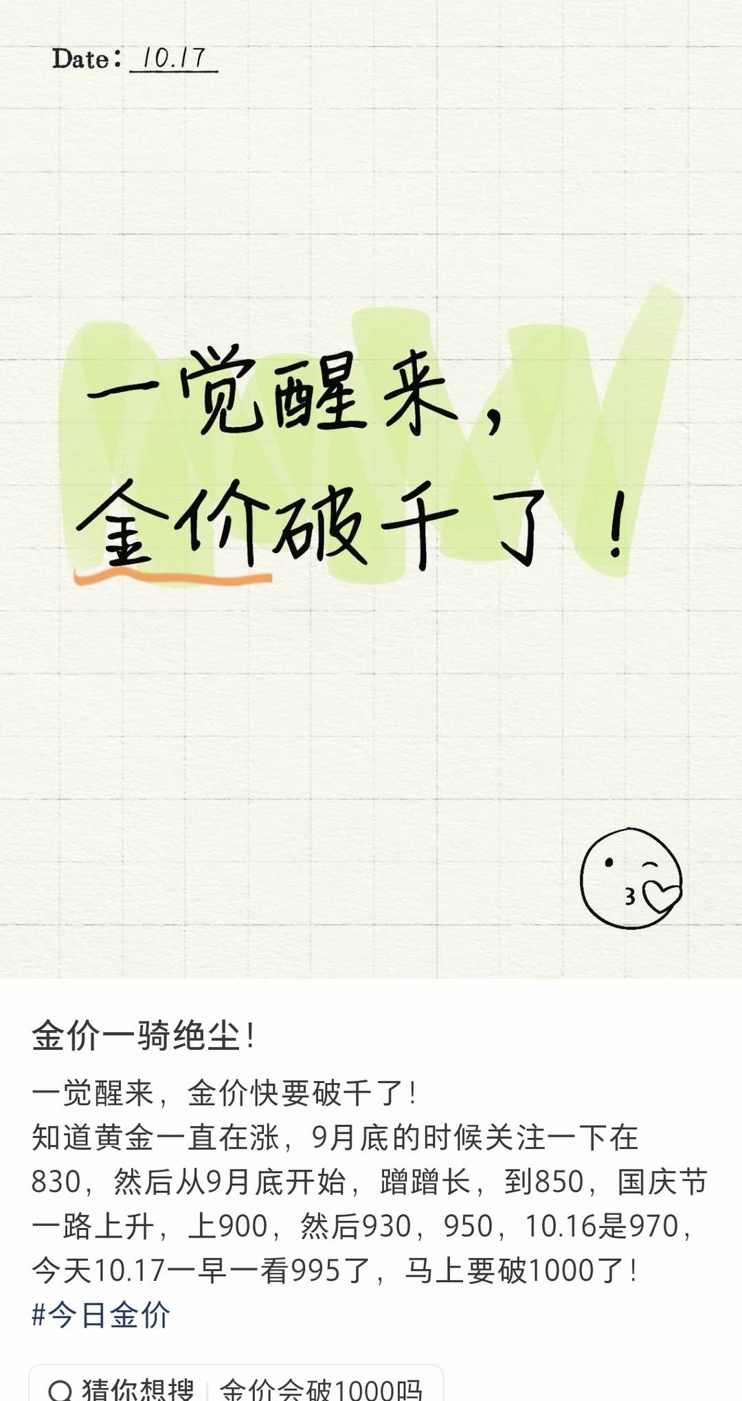 有人熬夜蹲守,有人理性消费;有人在波动中寻找机会,有人在变化里守住从容。金价能否站稳千元大关,至今仍是未知数。