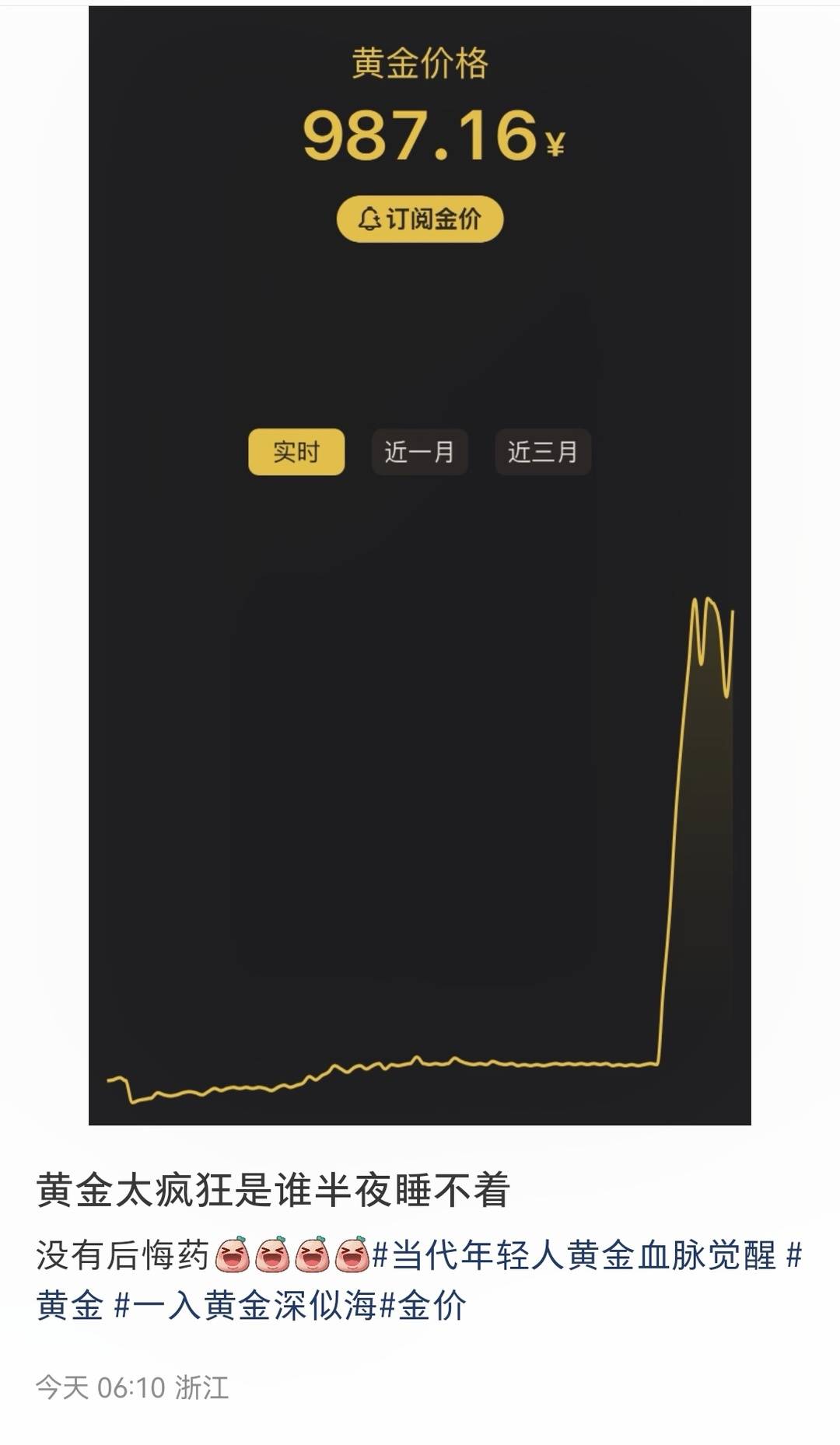同样陷入两难的还有刚工作不久的小林,原本计划用攒下的5万元买金条做“稳健理财”,如今却彻底犯了难。“从今年克价七八百时就开始观望,总想着等等看能不能降点,结果越等越涨,现在都超990了。”他对着手机里陡峭上扬的金价曲线叹气,“买吧,怕自己成了高位‘接盘侠’;不买吧,又怕错过这波行情,看着手里的钱越放越‘不值钱’,心里更慌。”小林无奈表示,现在每天都刻意避开网上的金价讨论帖,“各种伪‘专家’和投资者对前景预测众说纷纭,越看越迷茫,可刷到别人晒的收益单,又忍不住眼红,真是左右为难。”