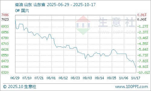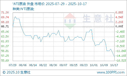 原油市场价格行情走势下滑,截止16日,美国WTI原油期货12月合约结算价报56.99美元/桶,布伦特原油期货12月合约结算价报61.06美元/桶。原油市场受利空因素影响,一方面欧佩克+已经启动165万桶/日的新一轮增产,市场依然担忧长线的供应过剩风险,原油市场行情持续走低;另一方面巴以局势缓和,加之美国需求减弱,美国关税问题拖累全球经济和需求预期,加之美国原油库存增加,美国用油旺季结束,全球经济前景及石油需求不乐观,导致国际油价行情急速下滑。原油行情直接影响国内成品油市场,国内汽柴油价格行情下滑为主。