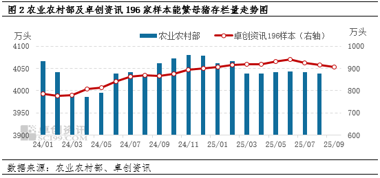 从农业农村部及卓创资讯196家样本监测能繁母猪数量可以看出,从2024年3月开始,能繁母猪存栏量呈现震荡增加态势。根据生猪生长周期推算,10月份生猪出栏量是2024年12月能繁母猪存栏量基数决定的,图2可以看出,2024年12月农业农村部监测能繁母猪存栏量为4078万头,卓创资讯样本监测为898.87万头,母猪基数均处于相对高位,这亦决定了10月份生猪出栏量较大,屠宰企业屠宰量亦增加,猪肉供应充足,但节后需求平淡,市场处于供大于求的状态,导致猪肉价格破年内新低。