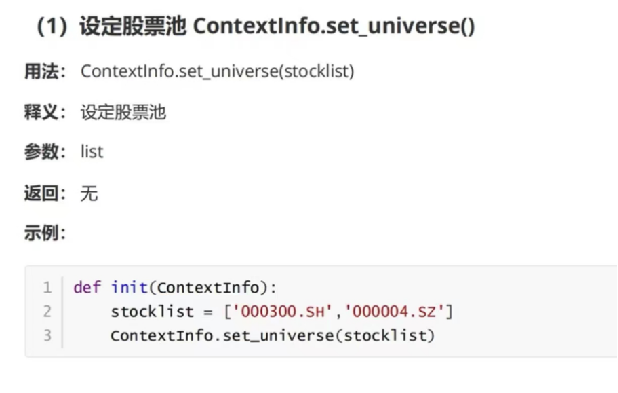 如:stocklist=Contextlnfo.get_stock_list_in_sector(‘沪深300’) .一般写在init函数中,如果需要动态设置也可以放handlebar里。