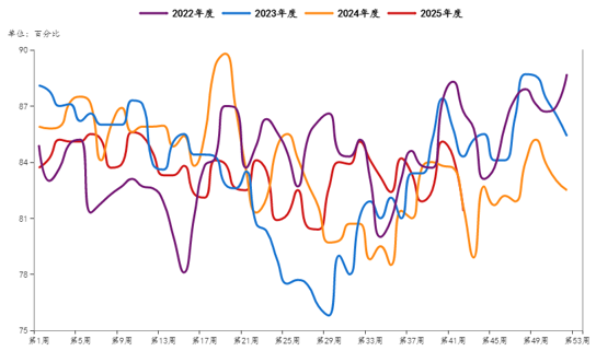 (2)氧化铝、粘胶短纤双弱,下游支撑全面不足。两下游需求疲软,对烧碱采购仅维持刚需,无法承接供应增量。氧化铝虽本周开工86.0%,但山东氧化铝利润持续下行,现货价格报2820元/吨,企业亏损压力加大,仅少量补库且成交价格持续下跌,对烧碱采购以压价按需为主,且持续亏损加重的高成本氧化铝企业减产的预期。粘胶短纤产能利用率88.61%,环比-1.02%,因溶解浆成本支撑乏力、终端人棉布工厂回款慢,新单跟进有限,企业对烧碱提货积极性减弱,非铝下游需求进一步承压。