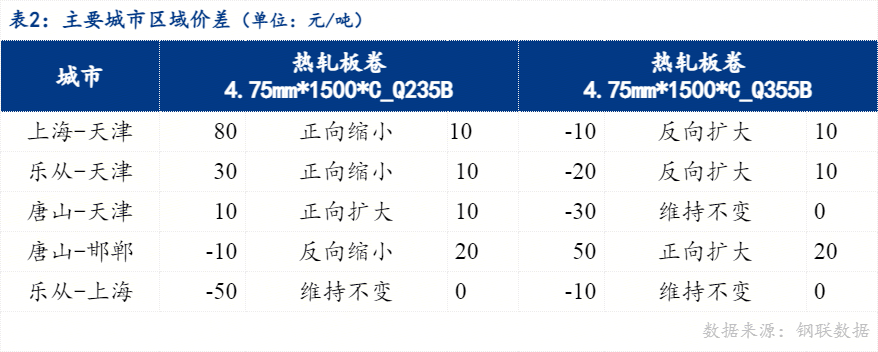 从区域价差来看,4.75mm普卷华南与华北价差30元/吨,华东与华北价差80元/吨,华南与华东价差-50元/吨。京津冀地区价差来看,唐山与天津价差10元/吨,唐山与邯郸价差-10元/吨。