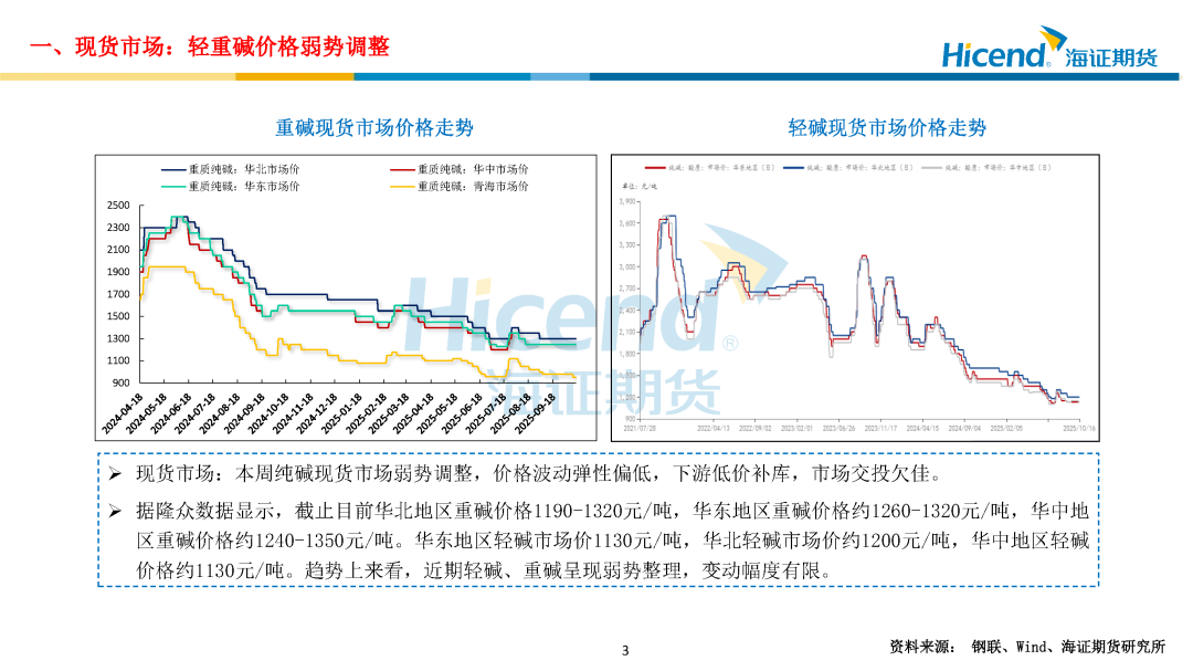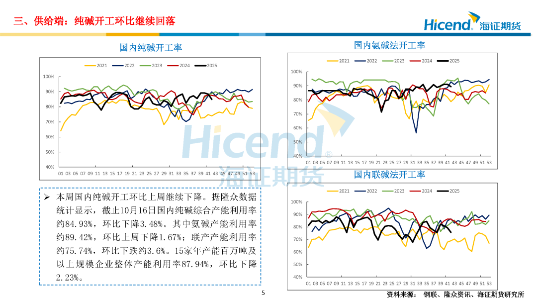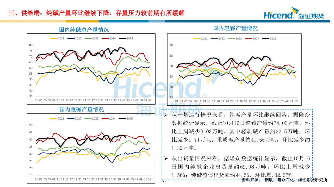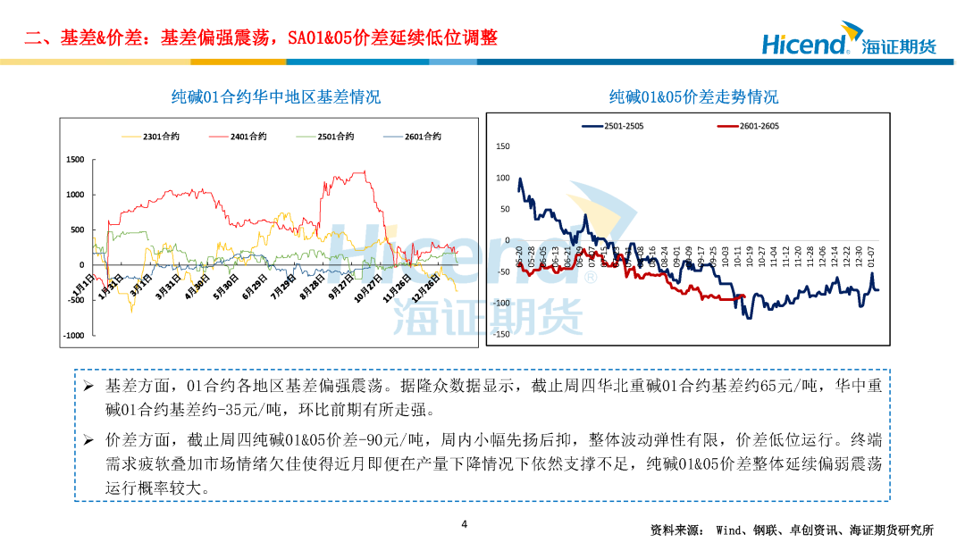 本周纯碱主力01合约承压上方均线系统弱势震荡,周五价格再度下探,周内整体表现较为疲软。截止周四收盘纯碱01合约最终报收于1235元/吨。