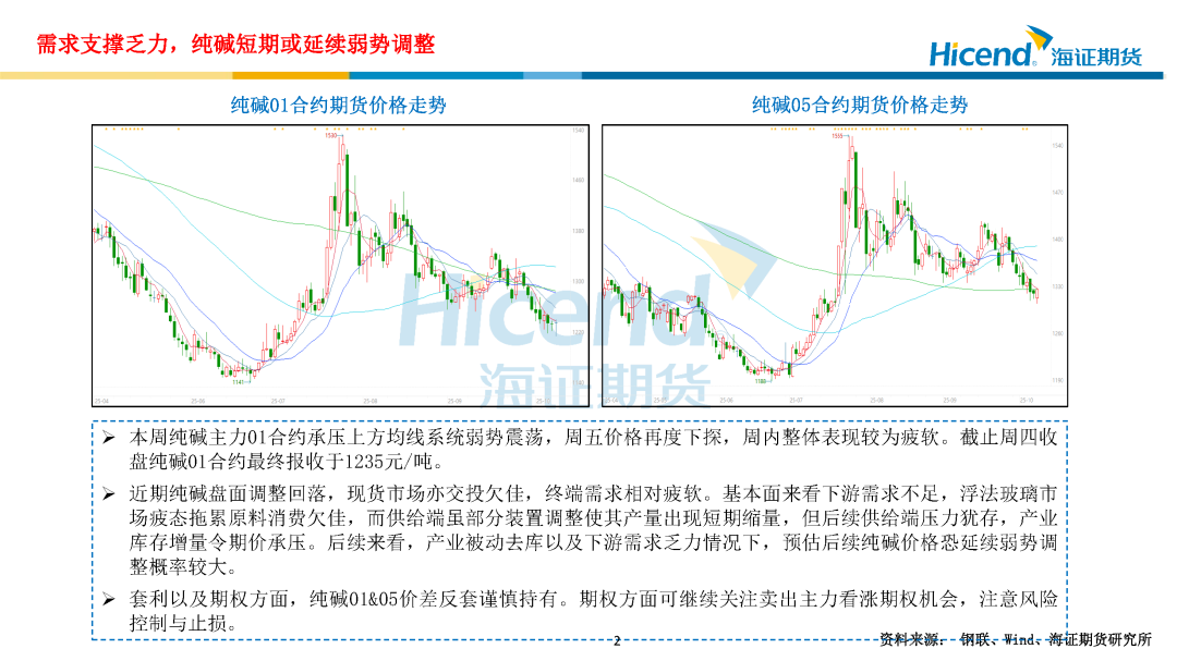 套利以及期权方面,纯碱01&05价差反套谨慎持有。期权方面可继续关注卖出主力看涨期权机会,注意风险控制与止损。