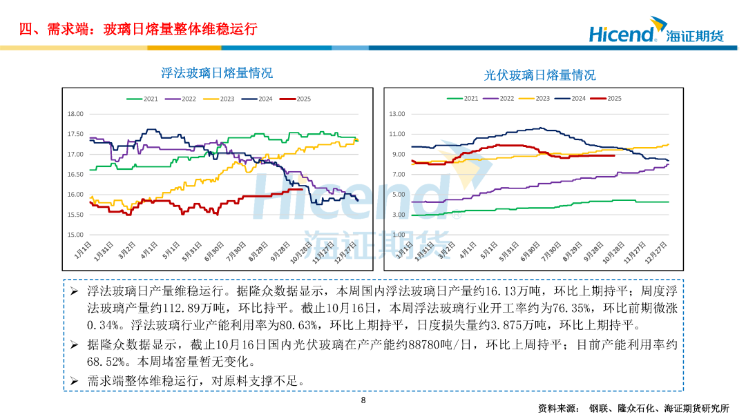 近期纯碱盘面调整回落,现货市场亦交投欠佳,终端需求相对疲软。基本面来看下游需求不足,浮法玻璃市场疲态拖累原料消费欠佳,而供给端虽部分装置调整使其产量出现短期缩量,但后续供给端压力犹存,产业库存增量令期价承压。后续来看,产业被动去库以及下游需求乏力情况下,预估后续纯碱价格恐延续弱势调整概率较大。