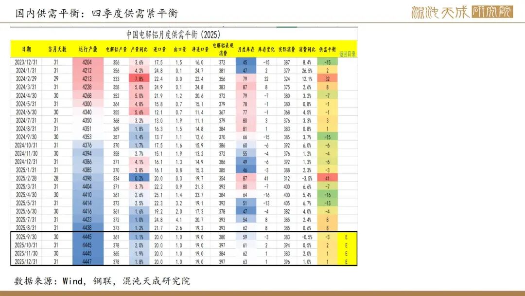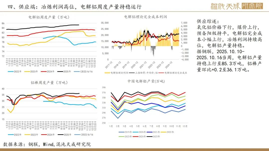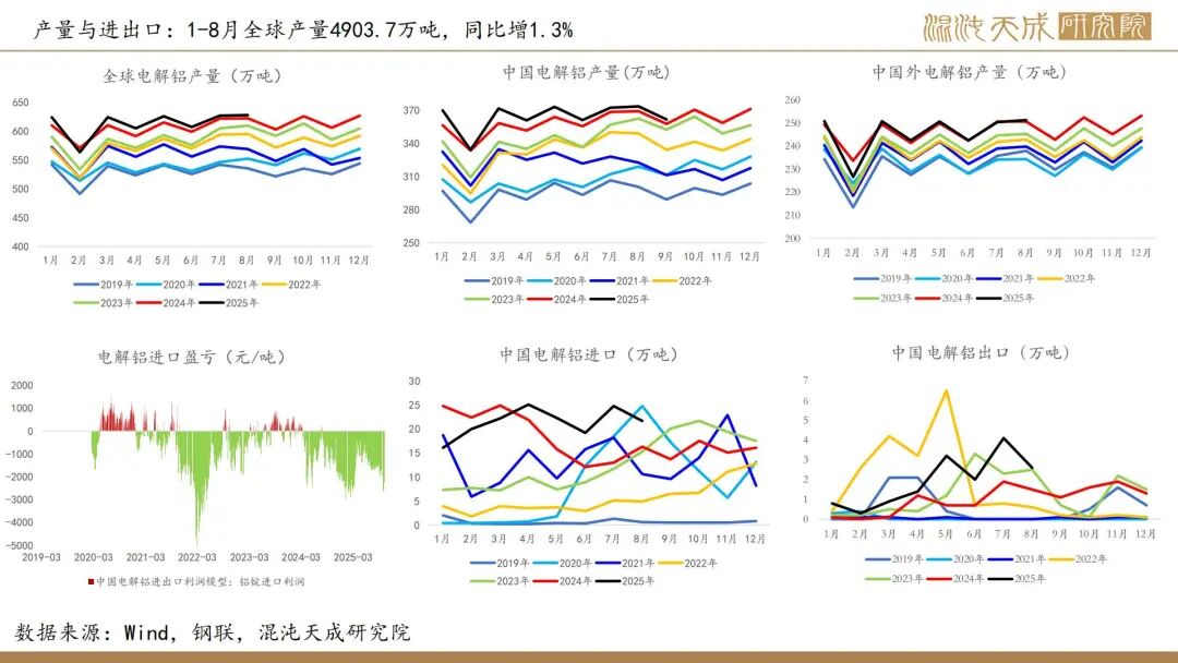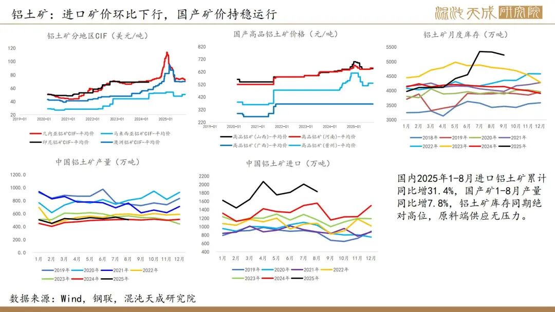 国产矿9月产量环比下行,国产矿价格持稳,进口矿价环比下行,氧化铝成本中枢继续下移。几内亚多家矿企就达皮隆共用运矿道路维护等签署协议,进口矿供应预计持稳上行,8月铝土矿进口季节性下行,国内铝土矿库存已补至同期高位,从原料平衡来看铝土矿完全够年内生产所需。氧化铝产量高位运行,供需仍过剩,同时进口压力也在增加,库存继续累库至同期高位,现货价格继续下行,周中河南某氧化铝企业检修降产引发停产预期,期价止跌回升。国内电解铝冶炼利润丰厚,供应持稳上行。