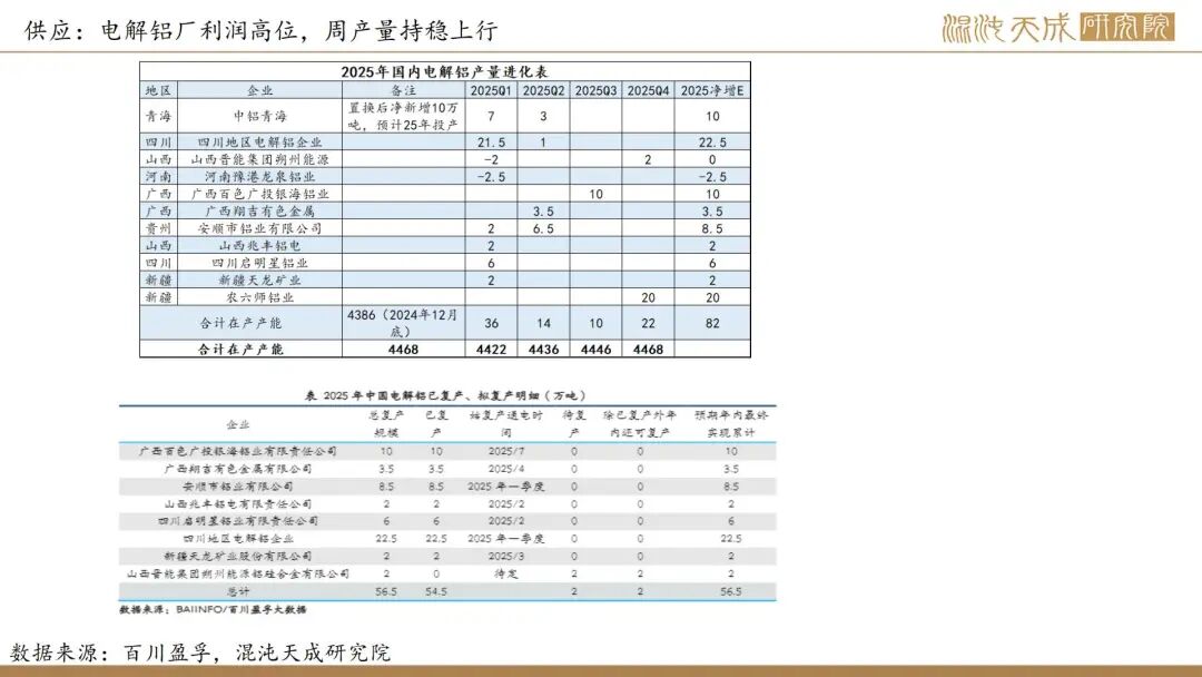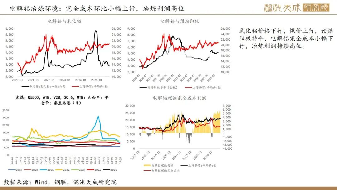 电解铝行业平均理论现金成本及完全成本约13900元/吨、15300元/吨,原料端氧化铝价格下行,煤价上行,预焙阳极持平,成本小幅下行,利润维持高位,前期停产产能持续复产,电解铝产量持稳上行。