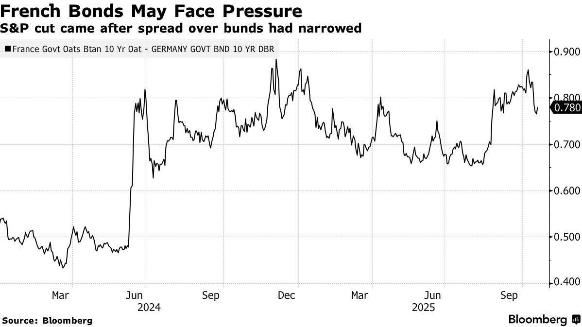 法国-德国10年期国债收益率利差——关键风险指标——本月早些时候由2024年提前选举前的不到50个基点飙升至近90个基点;勒科努上周挺过不信任投票并承诺暂停养老金改革后,利差收窄至约78个基点。此举虽暂时避免立即选举风险,却使财政整顿路径更加复杂,而这正是评级机构关注的核心。