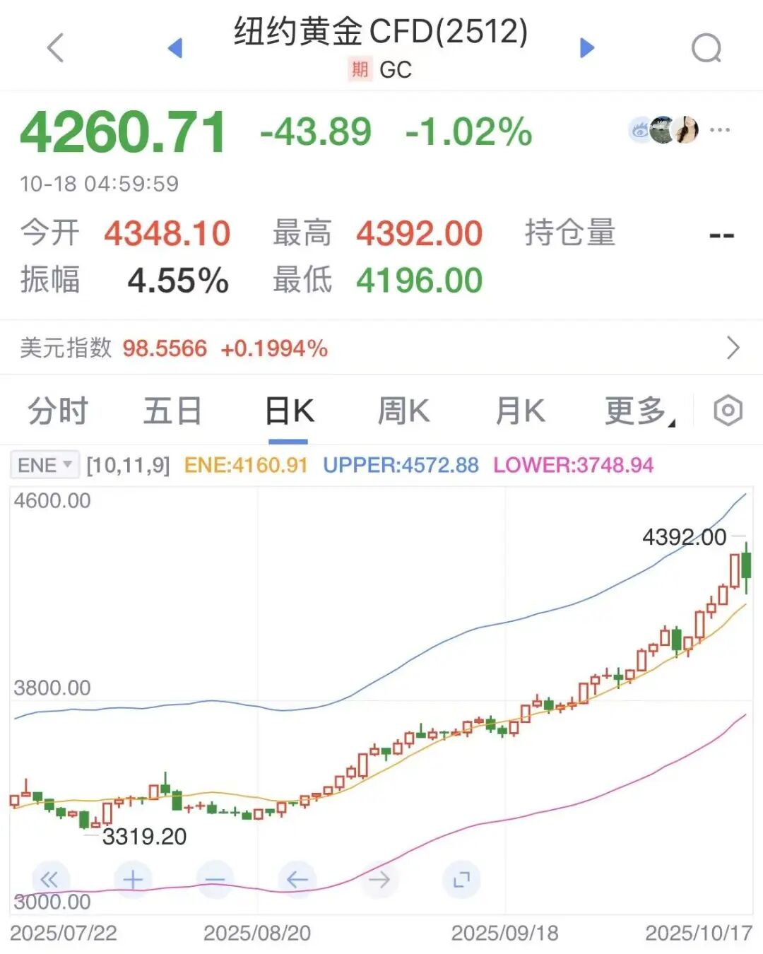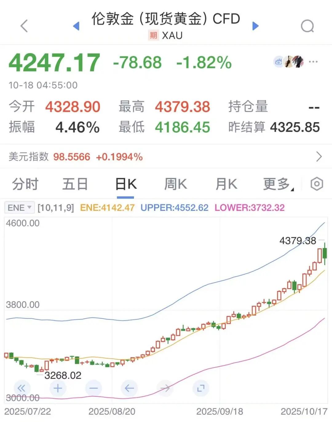 10月18日,伦敦现货金价最高4379.38美元/盎司,收于4247.17美元/盎司,大跌逾130美元。纽约期货金价4392美元/盎司,收于4260.7美元/盎司,同样大跌逾130美元。近期本公众号连续发出回调行情预警,本次回调除技术性因素外,主要因特朗普在关税问题上态度软化,市场对全球贸易摩擦的担忧降温,美元指数回升,国际金价在本月初自3900美元/盎司突破以来连续“五级跳”,出现回调行情实属正常。