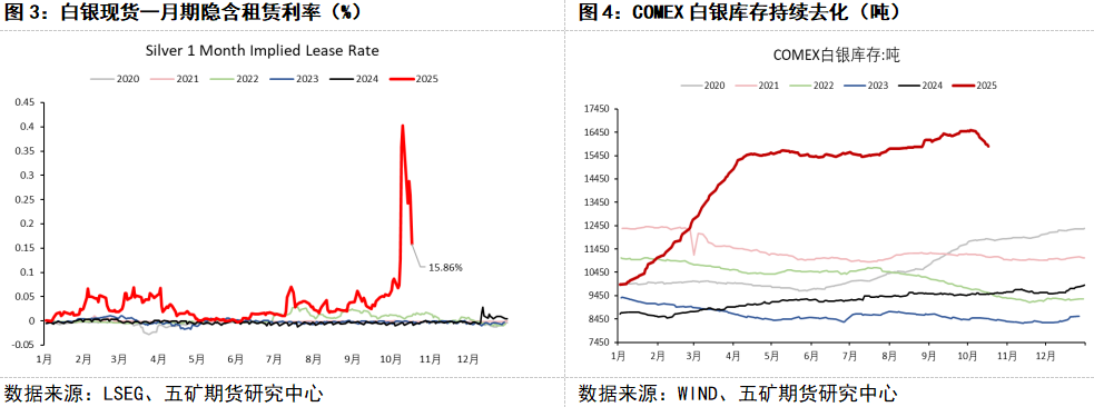 高银价背景下海外白银投资需求的旺盛是推动白银现货紧俏的重要原因,在美联储宽松预期逐步推升的驱动下,白银价格今年以来表现强势,2025年1月2日至10月17日,COMEX白银主力合约价格涨幅已高达72.72%,并在盘中达到53.76美元/盎司的历史新高水平。趋势性上涨的银价令海内外机构和个人投资者将白银纳入投资组合中,路透统计口径数据显示,海外主要白银ETF持仓总规模由今年2月6日区间低位的24957吨上升至10月17日的28259.31吨,其中规模最大的iShares Silver Trust持仓总规模同期由13333吨上升至15497吨。值得注意的是,海外白银ETF主要以白银实物进行担保,而全球最大的LBMA白银库存量截至九月份仅为24581吨。即使部分白银ETF的担保物并不存放于伦敦仓库,但ETF的实物锁定仍令伦敦白银现货呈现紧俏态势。海外白银一月期隐含租赁利率在10月10日达到区间高点的40.3%,白银纽伦价差则上升至2.73美元/盎司的区间高位,这也令纽约白银的库存持续流向伦敦.