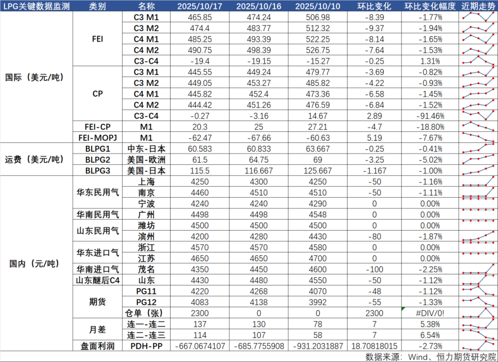 基本面:今日LPG内外盘价格均出现小幅回落。PG12期货合约小幅下跌,今日收于4083元/吨(+0.1%)。今日EIA发布数据显示10.10当周美国丙烷和丙烯库存增加187.5万桶(+2%),突破1.02亿桶大关。当周由于Oneok装置起火,导致C3产量大幅降至280.9万桶/日,为7月以来最低水平。当周出口虽大幅上升24.9万桶/日,但因国内需求骤减97.9万桶/日,导致库存维持上升趋势。高库存持续压制价格水平,当前美湾沿岸丙烷价格已跌至60美分/加仑,较前一交易日下跌2美分/加仑。