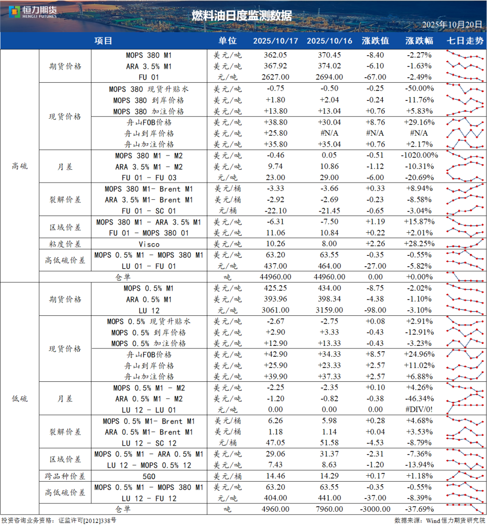 基本面:此前我们判断原油配额影响将在10月底显现,目前来看,山东仅一周已到港44万吨高硫,若维持这一到港节奏,预计10月山东到港总量可能达到100-120万吨左右,原油配额问题影响初现,继续支撑高硫。此外,供应端还存在三个主要扰动:1、欧洲安特卫普港口罢工虽已结束,但其影响还要持续一段时间,目前大约有160艘船在等待,一周内整个港口还是会处于拥堵状态。2、俄罗斯10月高硫出口偏低,之前俄罗斯提高了topping炼厂的开工所以出口减量少于预期,但目前来看,高出口难持续,预计10月、11月偏低。3、中东现在10月出口很高,但是主要的增量在伊拉克,伊拉克现在的出口量处于异常高位,预计后续将下修,加上库尔德原油出口重启的影响,伊拉克本地炼厂出高硫的量也会有所减少。低硫方面,低硫基本面依旧疲软,贸易商预计新加坡10月低硫到港量为270-290万吨,较9月环比上涨,但目前船期数据显示10月到港偏低,需要进一步关注。另一个变量在于丹格特和边佳兰炼厂RFCC即将回归,但回归之后装置开工多高,我们对此保持怀疑,存在装置开工不高、炼厂继续出口LSSR的可能性,继续关注炼厂招标情况。