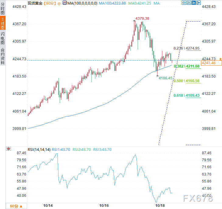 从技术面看,现货黄金上周五在4225-4205美元共振支撑带附近展现出韧性——该区域同时汇聚100小时简单移动平均线(SMA,4223.88)和10月9日至17日涨势的38.2%斐波那契回撤位(4211)。
