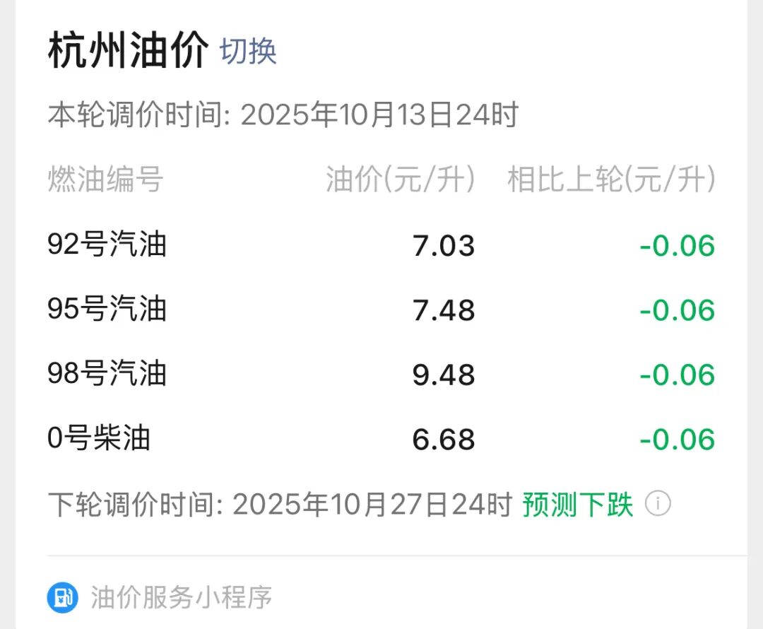 倒计时,成品油又将迎来新一轮调价窗口。长假结束后,油价迎来了一次小幅下调!但最近国际原油价格不断下跌,跌幅持续扩大,刚刚,据金联创最新测算,受国际油价回落影响,成品油或将迎来一次大跌,每升有望下跌0.25-0.3元/升,92号汽油将重返6元时代。
